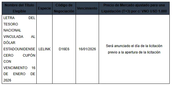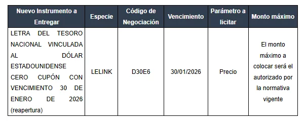 La Secretaría de Finanzas, en los términos del artículo 2º del Decreto 846/24, invita a los tenedores de LELINK con vencimiento 16 de enero de 2026 (D16E6), a participar de una operación de conversión según se detalla seguidamente: