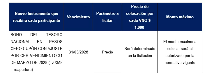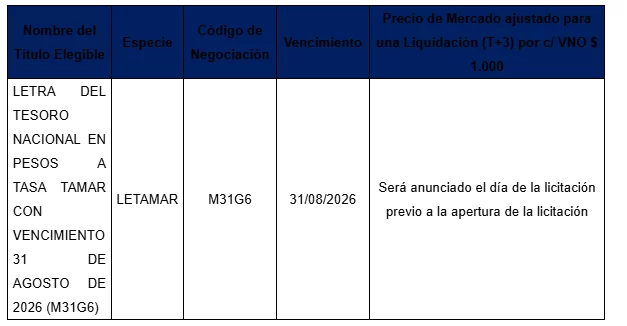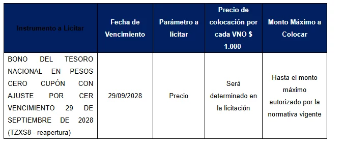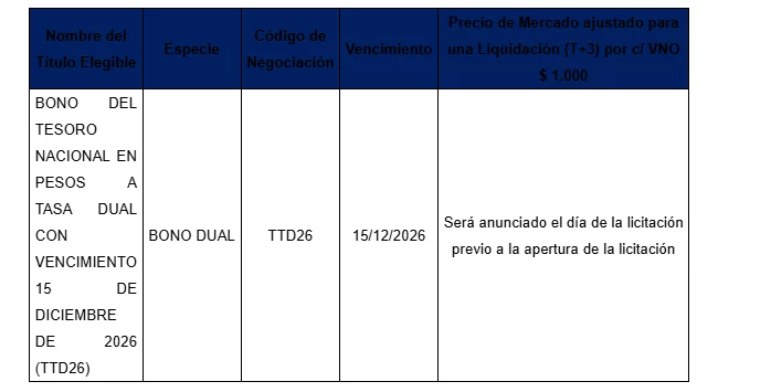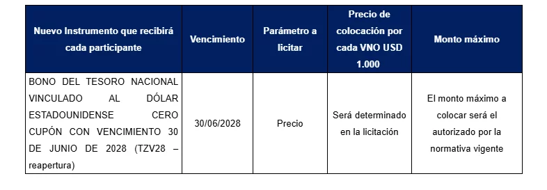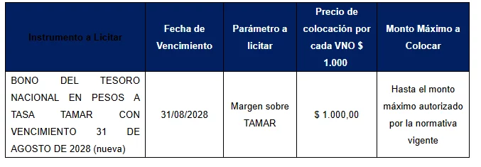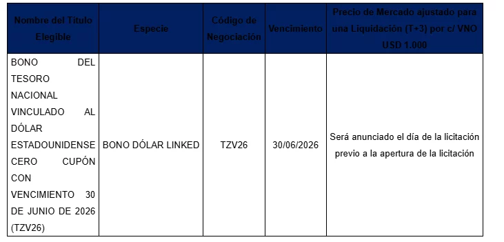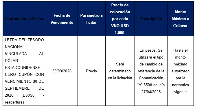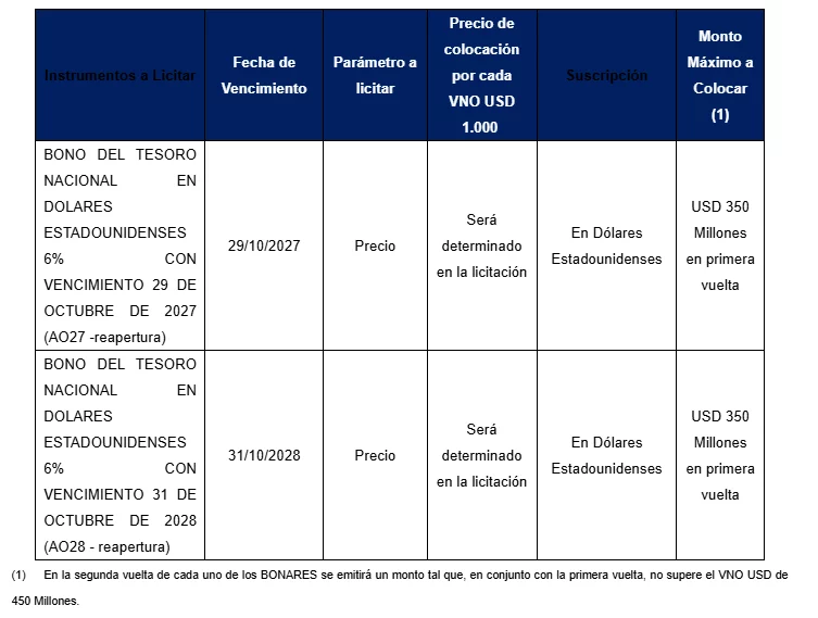 La licitación de la nueva LECAP, se realizará mediante indicación de la tasa efectiva mensual y la licitación de los restantes instrumentos se realizará mediante indicación de precio, sin precio mínimo ni máximo, a excepción del BONAR 2027 (AO27), que tendrá un precio máximo de USD 1.014,56, consistente con una TNA del 5% y una TIREA de 5,12%.