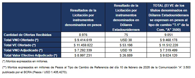 La Secretaría de Finanzas anuncia los resultados de la licitación del día de la fecha, en la que se recibieron ofertas por un total de valor efectivo de $ 11,51 billones, y se adjudicó un total de valor efectivo $ 9,02 billones.