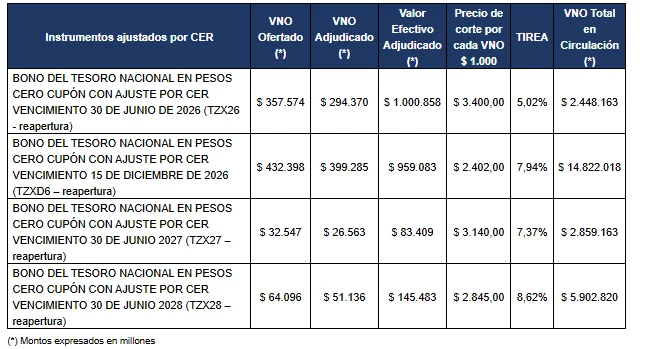 Seguidamente, se resumen por instrumento los valores nominales ofertados y adjudicados con sus respectivos valores efectivos adjudicados, precios y margen de corte, TIREAS asociadas y nuevos VNO en circulación: