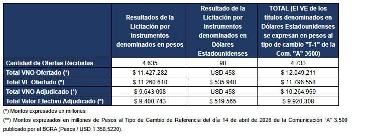 Se recuerda a los participantes cuyas ofertas hayan sido aceptadas que ANTES DE LAS 17 HS DEL DÍA VIERNES 17 DE ABRIL DE 2026 (T+2), los participantes con ofertas aceptadas deberán REALIZAR UNA ÚNICA TRANSFERENCIA DEL TITULO ELEGIBLE desde su cuenta en la CRYL del BCRA, a la cuenta de la Secretaría de Finanzas 99990-01 en esa entidad.