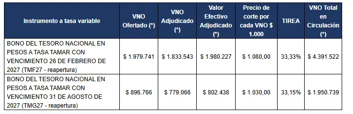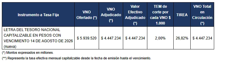 Por este tipo de instrumentos se recibieron ofertas por un total de valor efectivo de $ 11,80 billones, y se adjudicó un total de valor efectivo $ 9,92 billones.