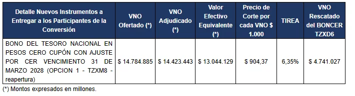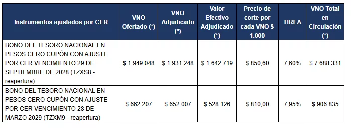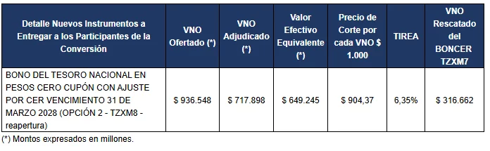 La Secretaría de Finanzas informa que en la licitación del día de la fecha se recibieron un total de 133 ofertas.  A continuación, se detallan los valores nominales ofertados y adjudicados del BONCER TZXM8 y el BONO TAMAR TMF28 y el valor nominal original rescatado de los títulos elegibles: