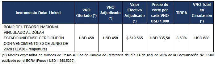 Adicionalmente se recuerda que, para el caso del BONAR 2027 y BONAR 2028, habrá una segunda vuelta el día 16 de abril de 2026 (T+1), que comenzará a las 11:00 hs. y finalizará a las 13:00 hs., la que será por adhesión con un único pliego al precio de corte de USD 1.017,72 por cada VNO USD 1.000 del BONAR 2027 y USD 952,75 por cada VNO USD 1.000 del BONAR 2028, en la cual se colocará hasta un VNO de USD 100 millones. Esta segunda vuelta, estará destinada a todas las personas humanas o jurídicas interesadas en participar, las que deberán realizar la presentación de sus ofertas a través del sistema de licitaciones.