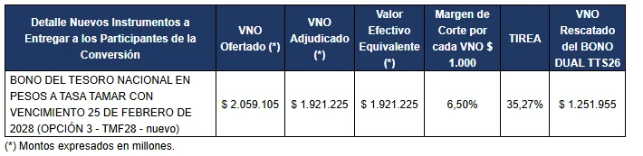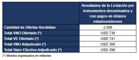 Resultado de la licitación por efectivo de instrumentos del Tesoro Nacional denominados en pesos, dólar linked, dólar estadounidenses y de la conversión de TZXD6, TZXM7 Y TTS26
