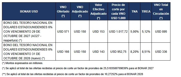 A continuación, se informan los resultados de la licitación del BONAR 2027 y BONAR 2028 del día de la fecha, en la que se recibieron ofertas por un total de valor efectivo de USD 741,19 millones, y se adjudicó un total de valor efectivo USD 295,57 millones.