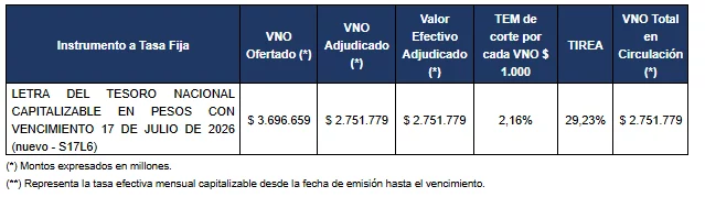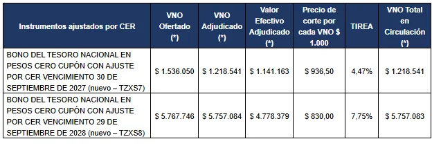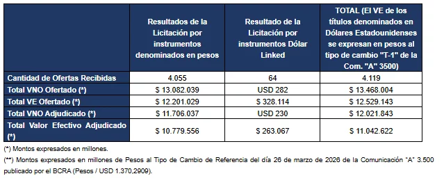 Resultado de la licitación por efectivo de instrumentos del Tesoro Nacional denominados en pesos y dólar linked y de la conversión de TZX26