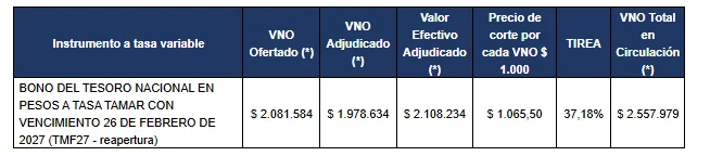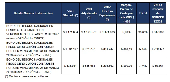 A continuación, se detallan los valores nominales ofertados y adjudicados del BONO TAMAR TMG27, del BONCER TZXM8, del BONCER TZXM9 y el valor nominal original rescatado del BONCER TZX26: