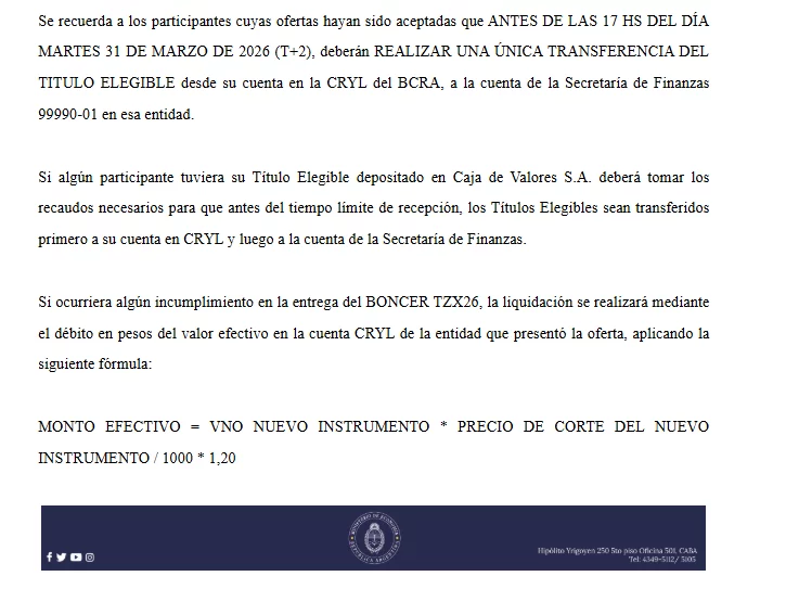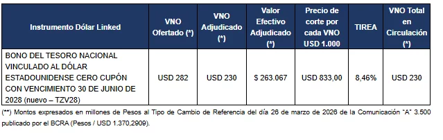 Adicionalmente se recuerda que, para el caso del BONAR 2027 y BONAR 2028, habrá una segunda vuelta el día 30 de marzo de 2026 (T+1), que comenzará a las 11:00 hs. y finalizará a las 13:00 hs., la que será por adhesión con un único pliego al precio de corte de USD 1.015,33 por cada VNO USD 1.000 del BONAR 2027 y USD 942 por cada VNO USD 1.000 del BONAR 2028, en la cual se colocará hasta un VNO de USD 100 millones. Esta segunda vuelta, estará destinada a todas las personas humanas o jurídicas interesadas en participar, las que deberán realizar la presentación de sus ofertas a través del sistema de licitaciones.