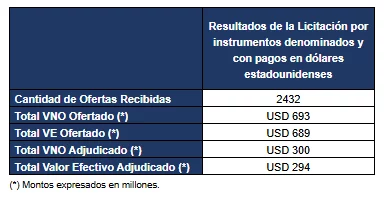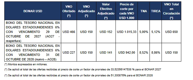 A continuación, se informan los resultados de la licitación del BONAR 2027 y BONAR 2028 del día de la fecha, en la que se recibieron ofertas por un total de valor efectivo de USD 688,73 millones, y se adjudicó un total de valor efectivo USD 293,60 millones.